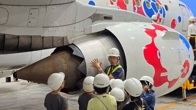 当日は、小学生と保護者の合計44名が参加し、「JAL ミャクミャクJET」の機体に未来への願いや夢を込めた寄せ書きを行いました。さらに、整備士による「航空教室」や、客室乗務員・地上スタッフによる「大阪・関西万博クイズ」で楽しく知識を深めました。イベントの締めくくりには、参加者全員で格納庫から「JAL ミャクミャクJET」を見送り、お子さまが描く「それぞれの未来のはじまり」にエールを送りました。