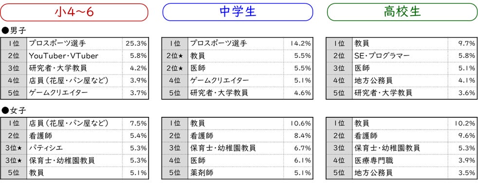 なりたい職業No.1は、小4~6生では「プロスポーツ選手」、中学生では「プロスポーツ選手」と「教員」、高校生では「教員」だった。男女によって、なりたい職業には違いがある。また、男女でなりたい職業は異なり、小4~6の男子は「プロスポーツ選手」、女子は「店員(花屋・パン屋など)」が人気。【図表4-1、4-2】