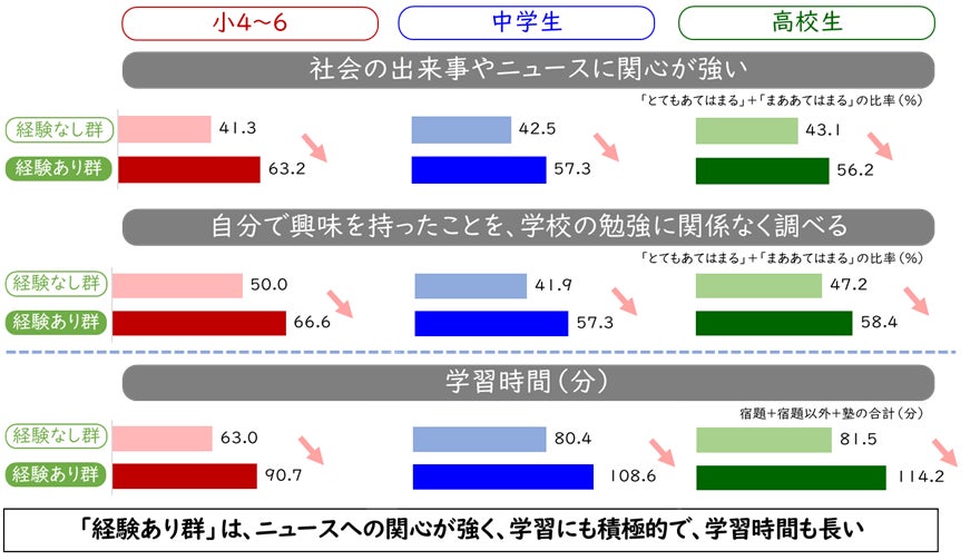 「経験あり群」の子どもは、「ニュースに関心が強い」「興味を持ったことを、学校の勉強に関係なく調べる」の肯定率が高く、学習時間が長いなど、学習に積極的。【図表1-2】