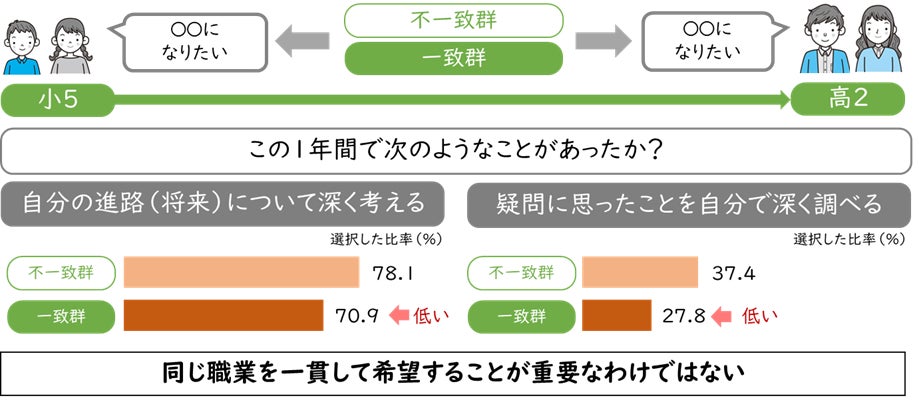 *同じ子どもで小5と高2のなりたい職業の職業名の記述が一致しているか、一致していないかで2群に分けて分析した。各項目の数値は、高2時点のデータ。