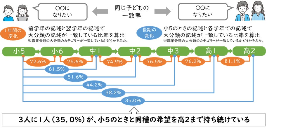 なりたい職業の記述について個人の変化を分析したところ、3人に1人(35.0%)が小5のときと同種の希望を高2まで持ち続けている。【図表3-1】