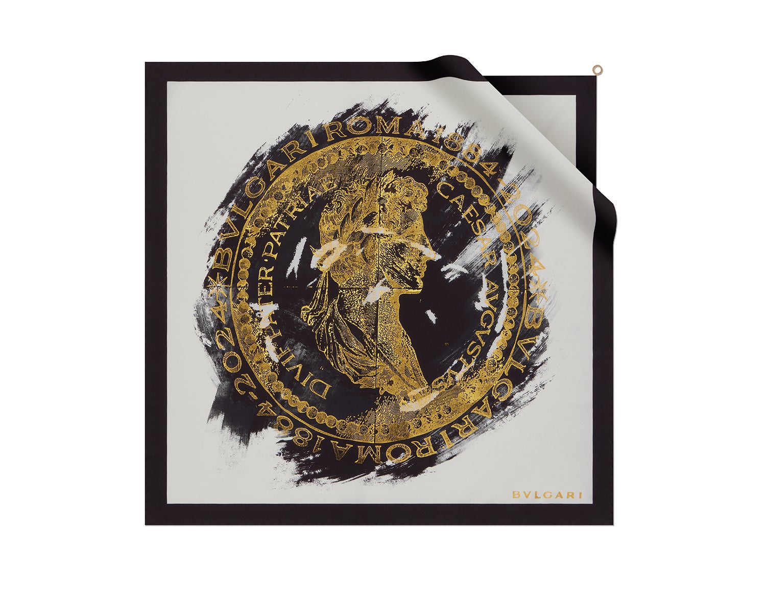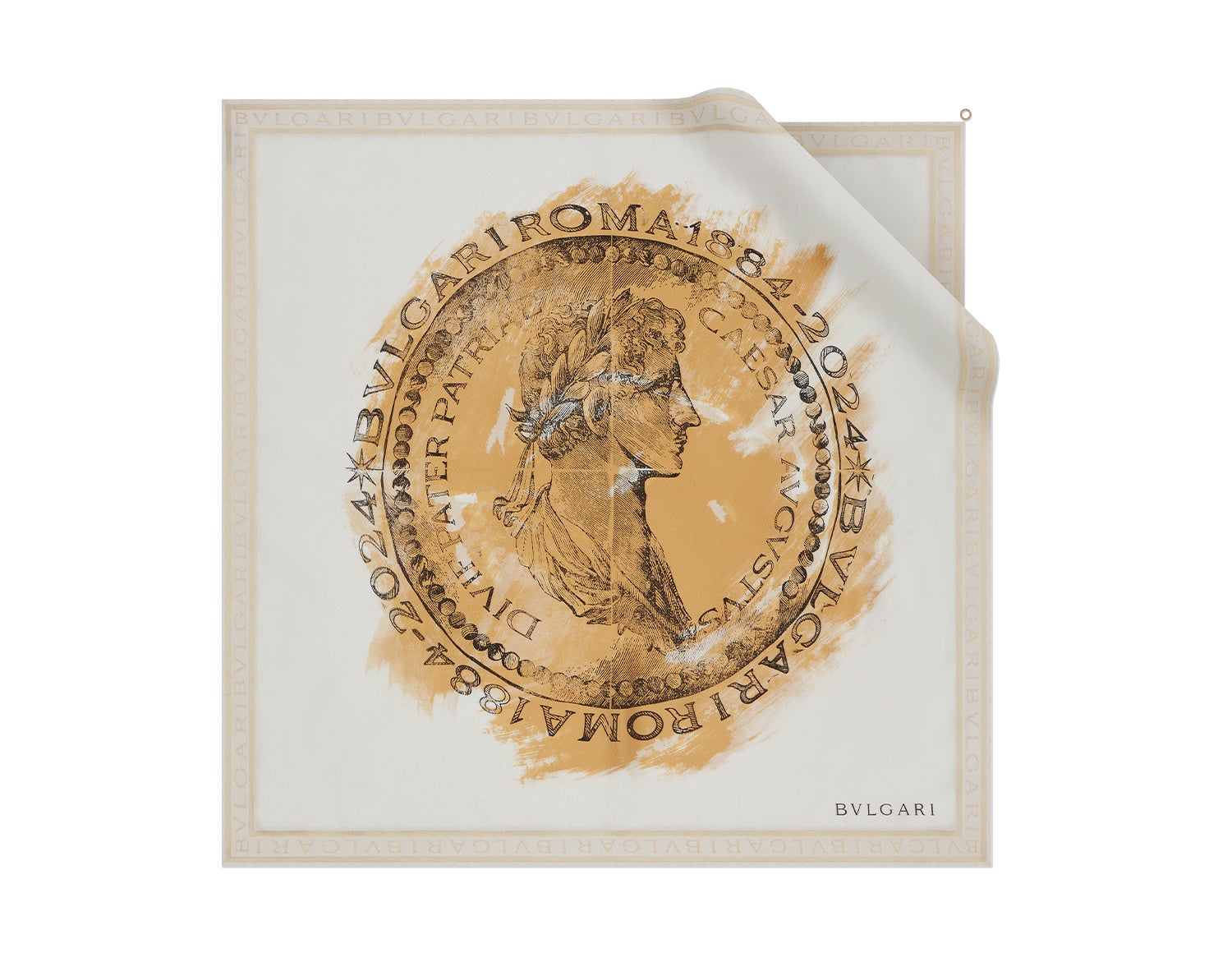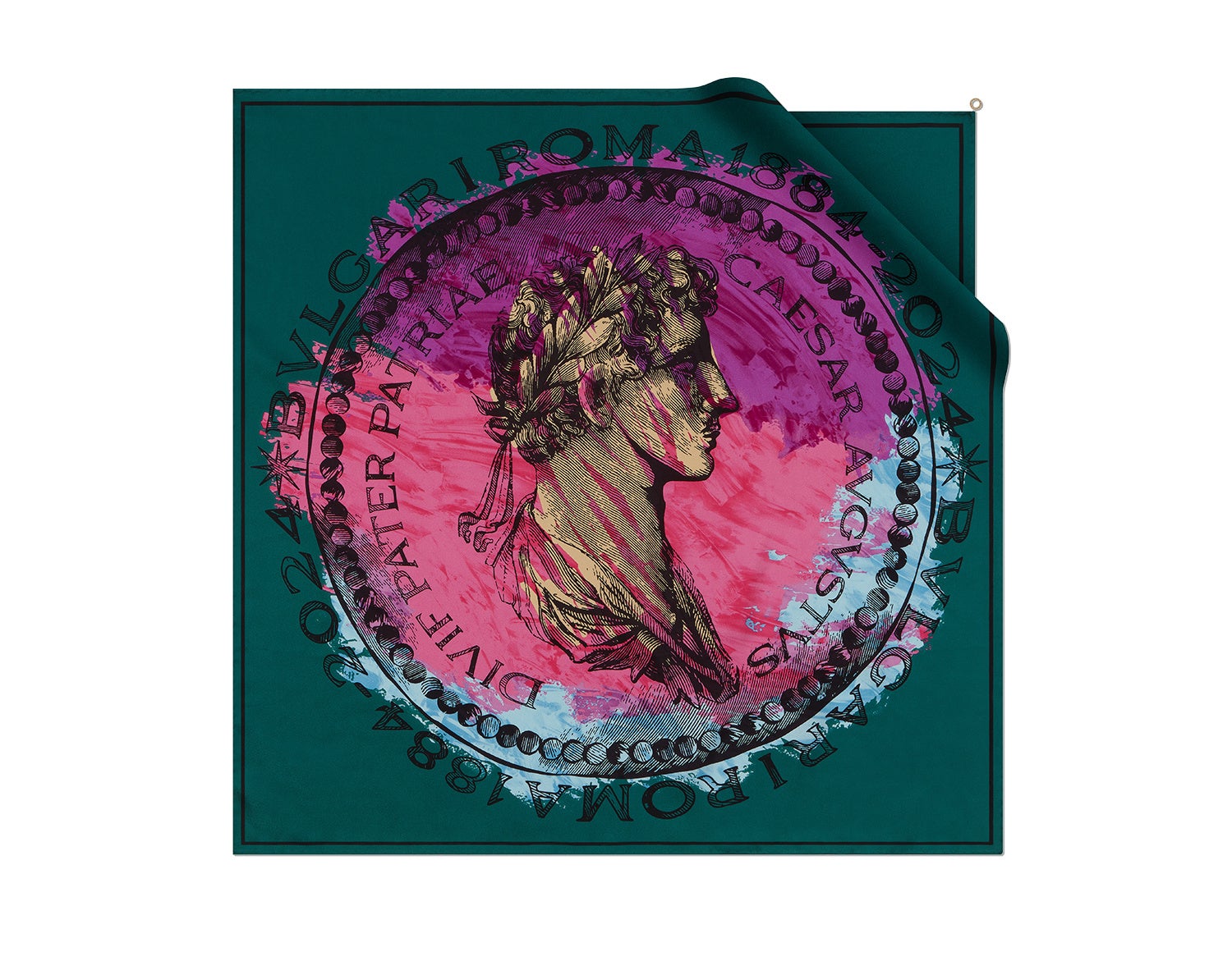 2024年春夏アクセサリーコレクションの最も際立った特徴を一つ一つのクリエイションに落とし込んだテキスタイルは、至高の素材と卓越した職人技で光と色の交錯を表現しました。魅惑的なセルペンティから伝説的なモネーテまで、ブルガリの最もアイコニックでスタイリッシュなモチーフに加え、ローマの文化遺産への終わりなきオマージュが新しい印象的な表現となって、無限のスタイリングを叶える鮮やかなスカーフやストールを生き生きと輝かせます。アウグストゥス シルクスカーフは想像上の古代のコインのように、皇帝の輝かしい横顔と創業140周年を記念した「BVLGARI ROMA 1884-2024」の銘文をメインに配しました。