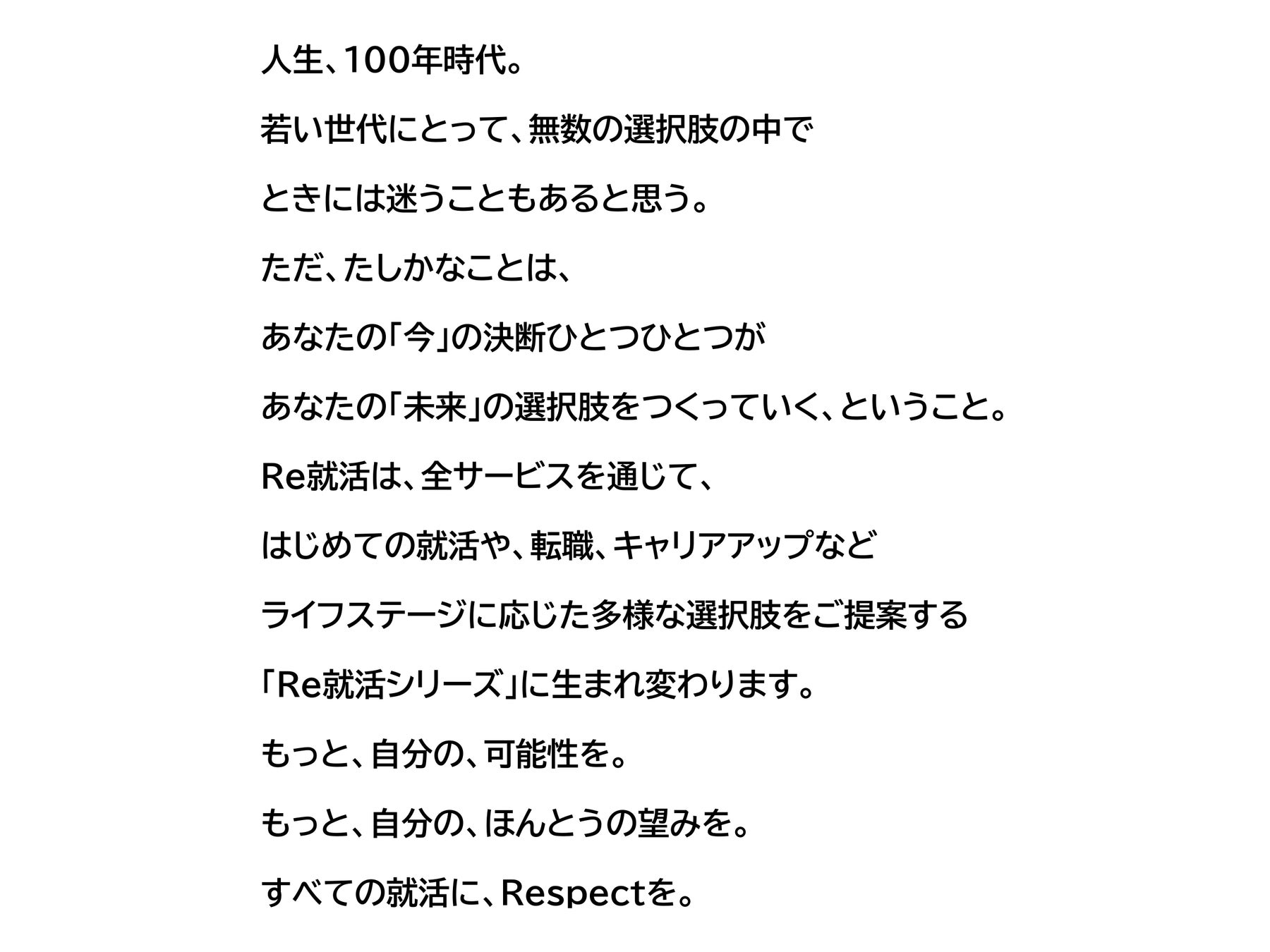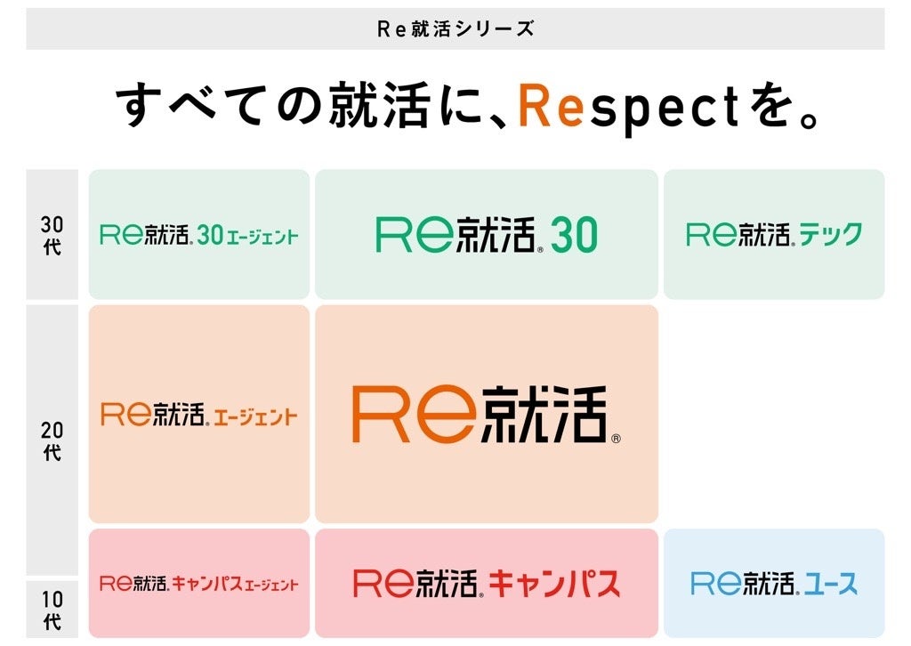 「Re就活シリーズ」は、「すべての就活に、Respectを。」をブランドスローガンに、10代~30代の転職希望者、学生の転職・就職を応援しています。
