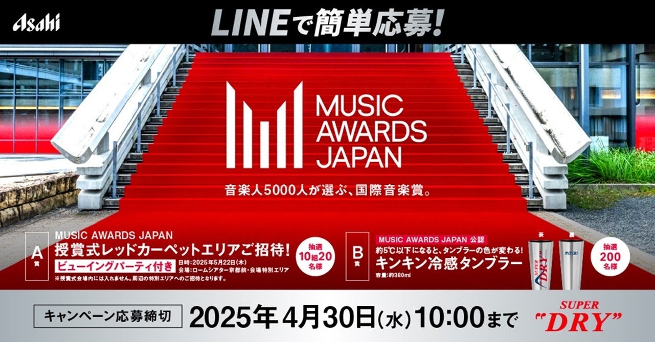 4月17日からは「MUSIC AWARDS JAPAN 2025」の授賞式のレッドカーペットエリアへ招待するチケットなどが当たるキャンペーンを実施します。アーティストが会場入りする様子など、会場の活気を間近で体験できることに加え、授賞式のビューイングパーティー※2にも参加できます。