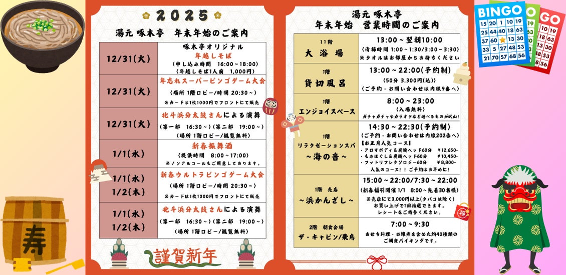年末年始期間、少々空室がでましたのでご予約いただける日もございます。
