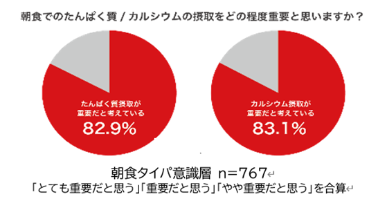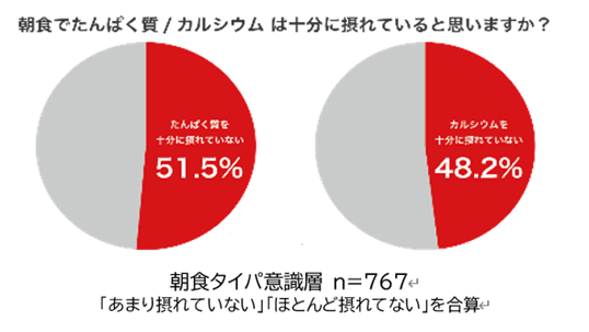 併せて、朝食にタイパを重視する層の栄養意識を探ったところ、8割以上が朝食での「たんぱく質」(82.9%)と「カルシウム」(83.1%)の摂取を重要だと考えていることが分かりました。しかし、その重要性を認識しながらも、実際には半数近くが「十分に栄養を摂れていない」(たんぱく質51.5%、カルシウム48.2%)と感じています。朝食時間の短縮と効率的な栄養摂取の両立、つまり「タイパ」の良い朝食を摂ることに苦慮していることが推察されます。