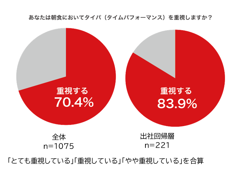 今回の調査では、現役世代の70.4%が「朝食にタイパを重視している」と回答し、特に、出社回帰層*では83.9%にのぼりました。限られた朝の時間内で、時間を無駄にせず、効率よく満足のいく食事を済ませたいと考えている現役世代が多いことが分かります。また、出社回帰層の結果から、通勤時間の増加により、朝の支度時間が限られることで、タイパ意識が強化されることが推測されます。