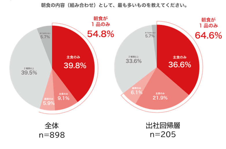 時短志向の結果、現役世代の約8割、特に出社回帰層では9割弱が朝食の簡素化を体感。食事内容も主食・主菜のみといった「1品化」が半数以上に。
