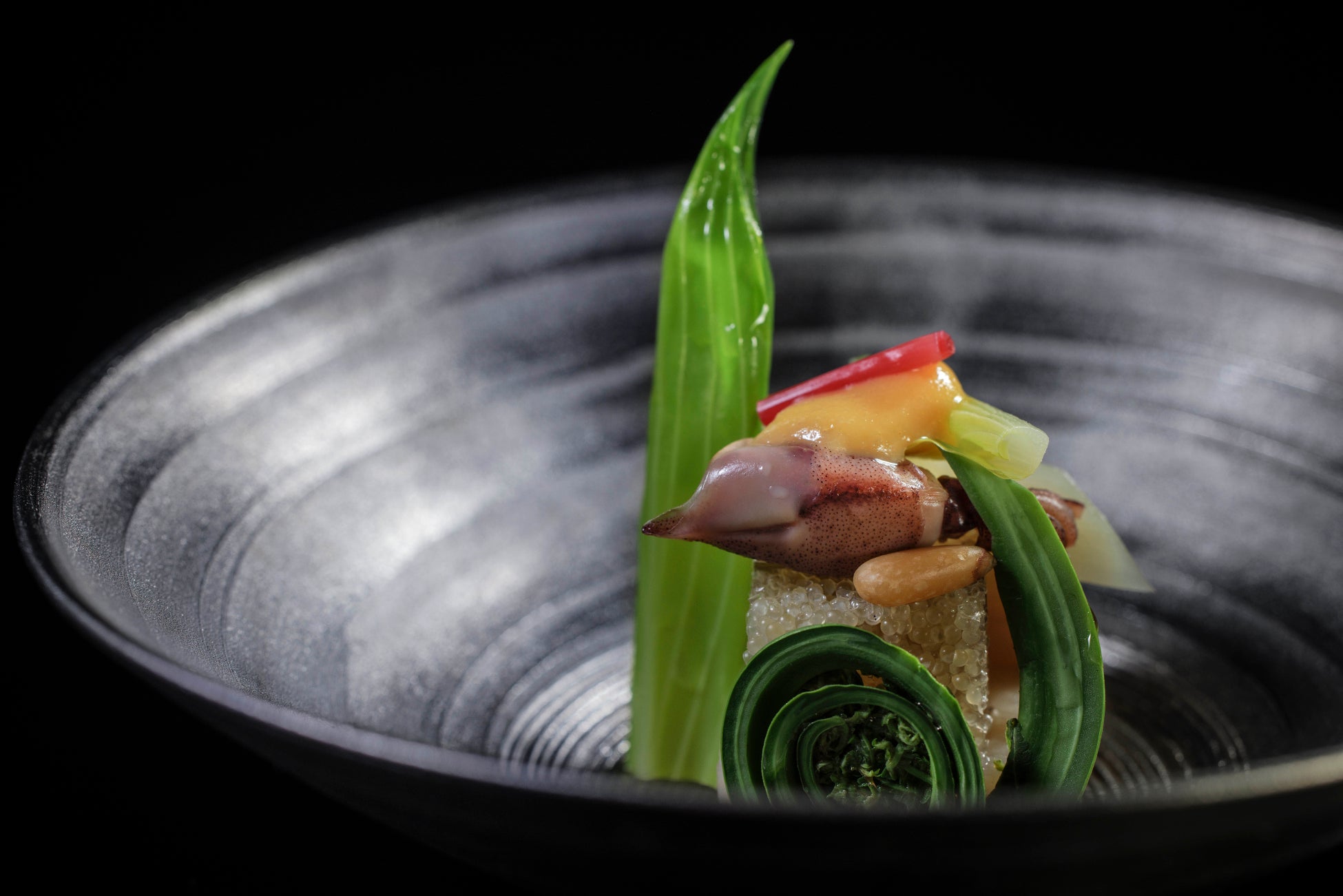 春を代表する山菜、うるいと磯の香り豊かなエボシ貝を組み合わせた先附です。うるいのシャキシャキとした食感と、エボシ貝の濃厚な旨味が調和しています。ホタルイカや子持ち若芽を添え、酸味が特徴の木の実、サルナシを使った酢で爽やかに仕上げました。