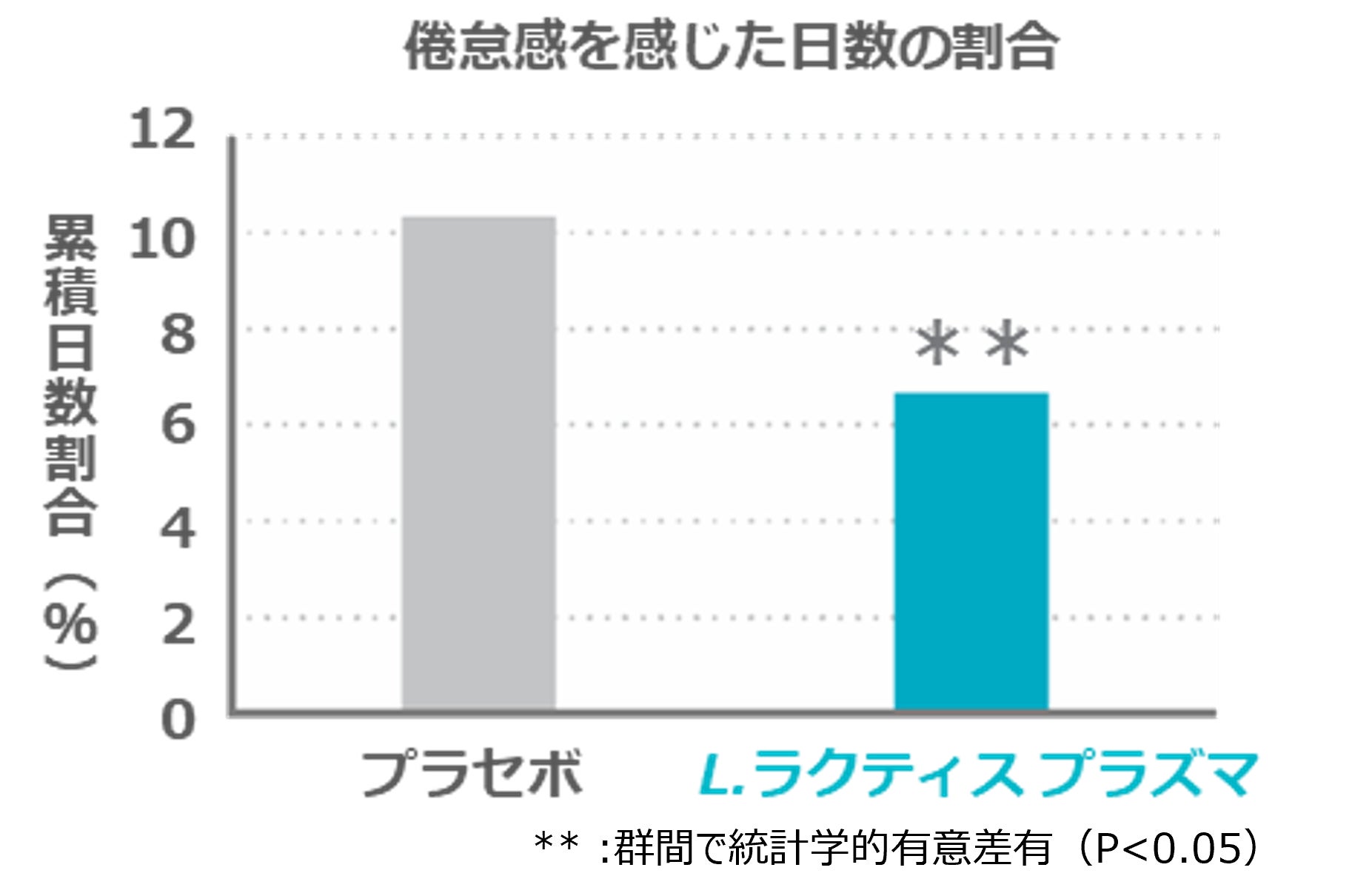 医学生101名をL.ラクティス プラズマ摂取群52名とプラセボ群49名に分け、4週間の摂取を継続し、症状や血中の免疫応答を比較しました。その結果、L.ラクティス プラズマを摂取した群では、プラセボ群に比べて発熱や倦怠感を感じた日数の割合が有意に少ないことが示されました。