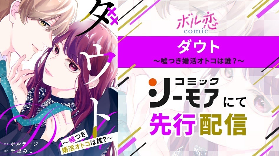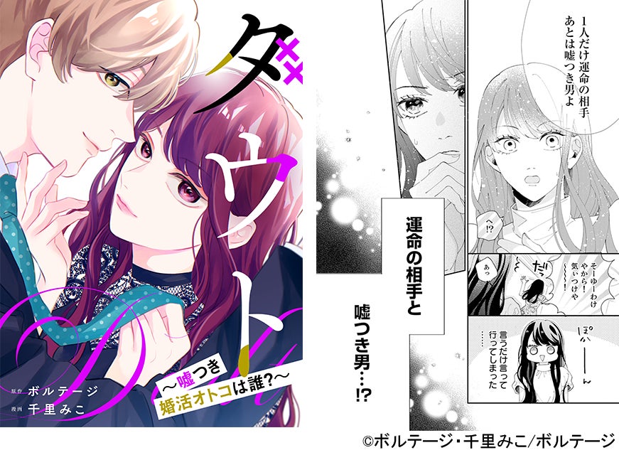 株式会社ボルテージ(本社:東京都渋谷区 代表取締役:津谷 祐司)は、オトナ女子向けオリジナルコミックレーベル「ボル恋comic」にてボル恋タイトル「100シーンの恋+」内で配信中のタイトルを原作としたコミカライズ作品「ダウト~嘘つき婚活オトコは誰?~」(以下「ダウト」)を7月18日(木)よりエヌ・ティ・ティ・ソルマーレ株式会社(本社:大阪市中央区 代表取締役社長:朝日利彰)が運営する、国内最大級の総合電子書籍ストア「コミックシーモア」にて先行配信したことをお知らせいたします。
