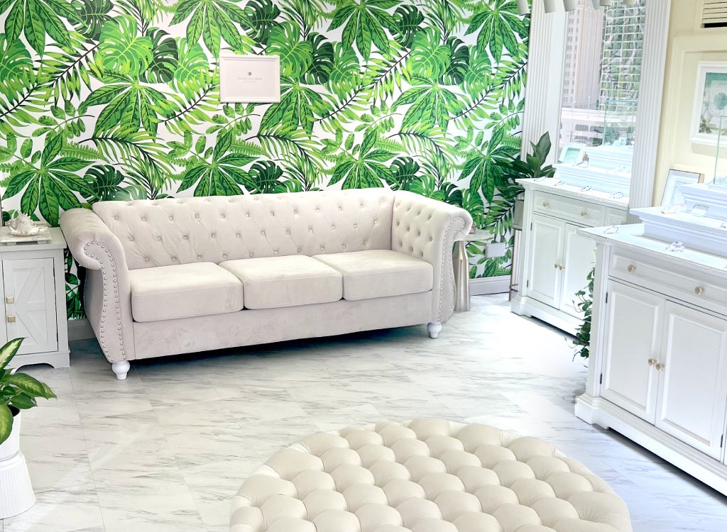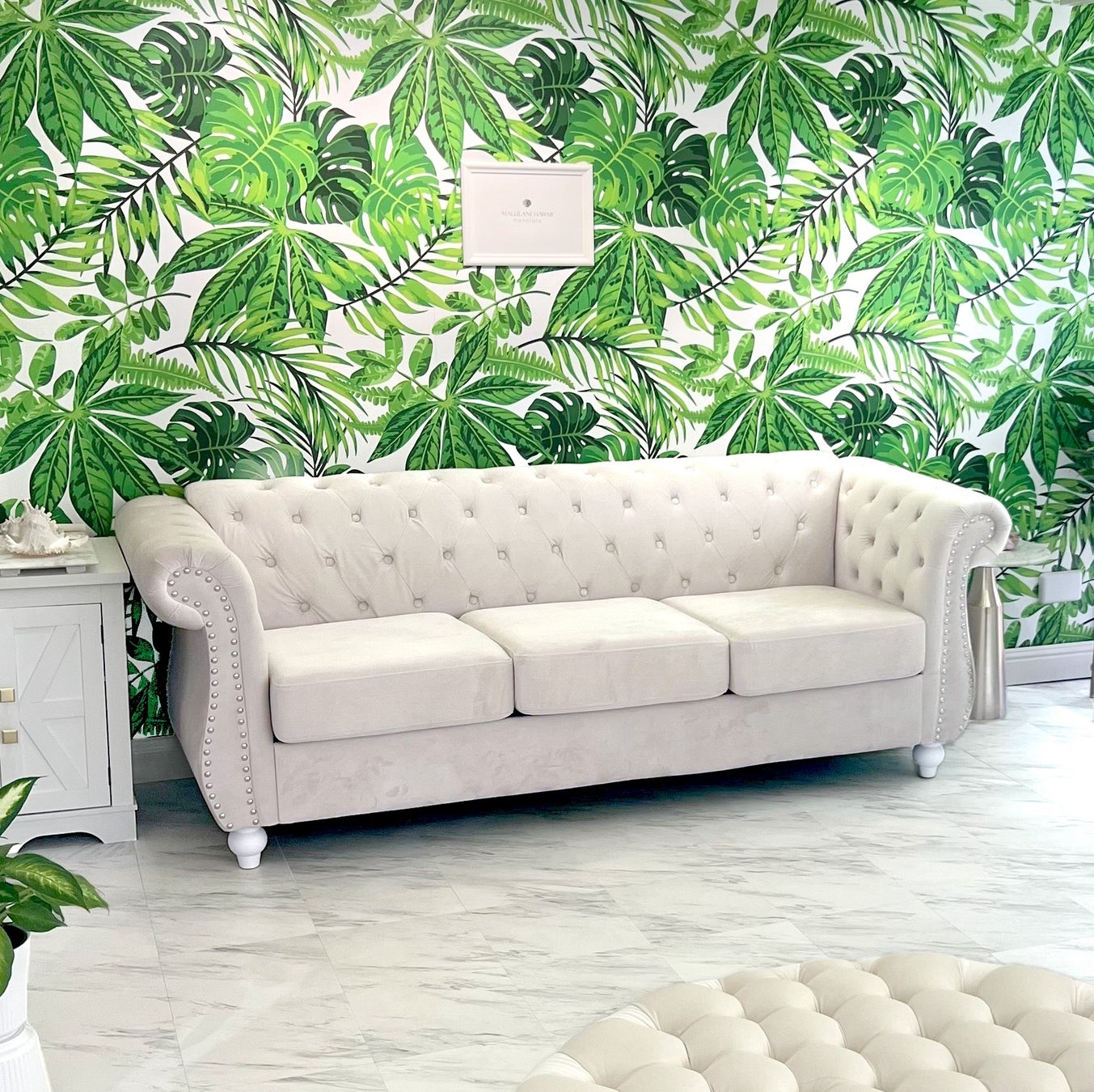ハワイの自然をイメージした背景に置かれたソファーは、大人数にも対応可能。