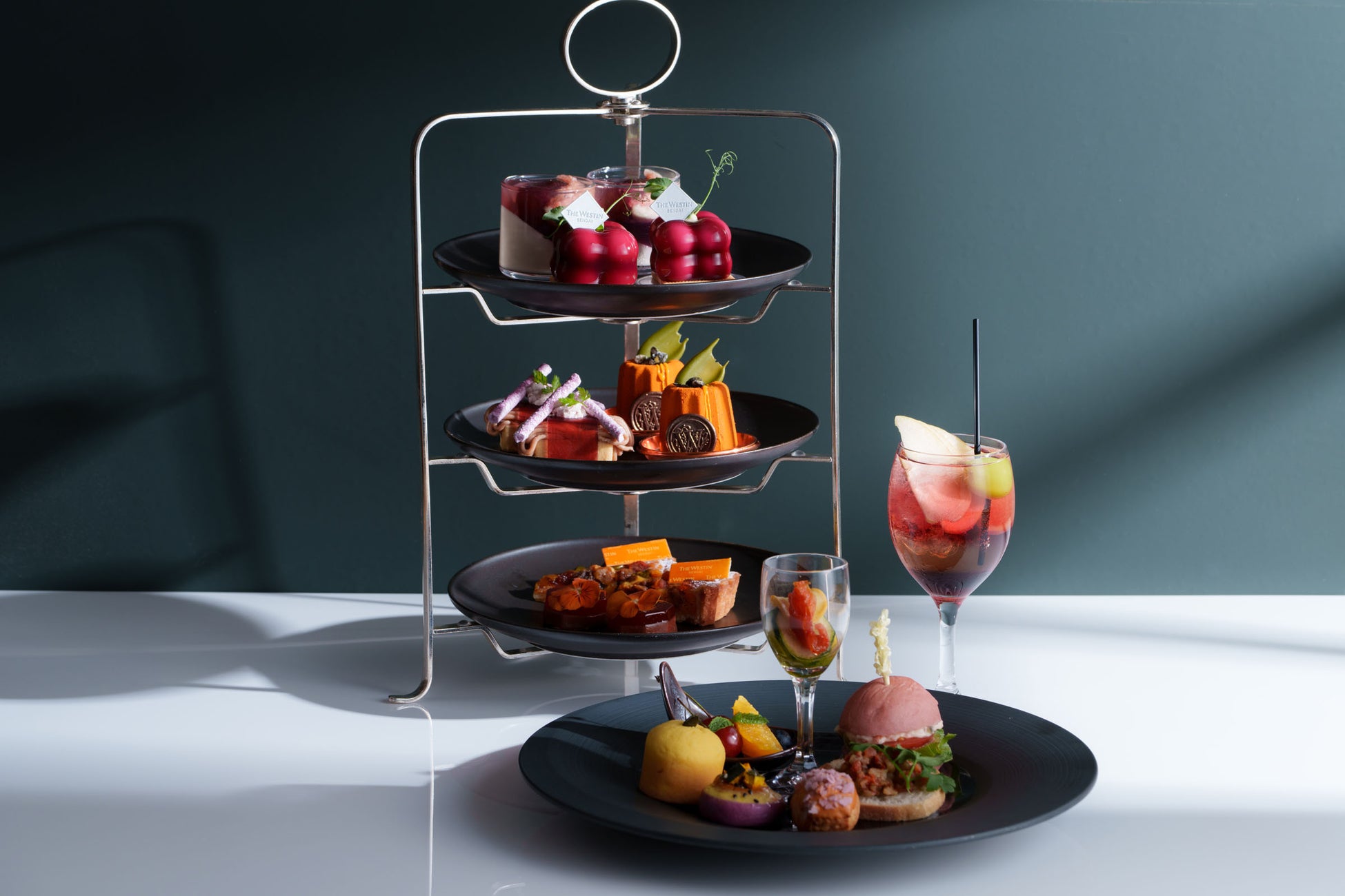 2024年9月14日(土)より始まる『Autumn Gradation Afternoon Tea(オータム グラデーション アフタヌーンティー)』では、ぶどう・いちじく・洋なしなど秋に食べごろを迎えるフルーツを、オレンジ・レッド・パープルなどの秋色に身を包んだスイーツでご用意しました。ぶどうの房を模りぶどうのジュレを纏ったレアチーズケーキや、いちじくと洋なしをトッピングしたチャイのパンナコッタ、濃厚なかぼちゃのブリュレを忍ばせたチョコレートのムース。そのほか、甘酸っぱいカシスのモンブランや、さつまいもの甘みを醤油で引き出したオペラなど、艶やかなスイーツが並びます。