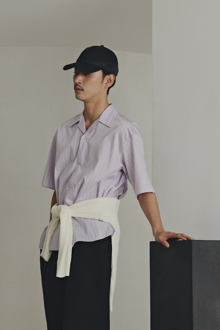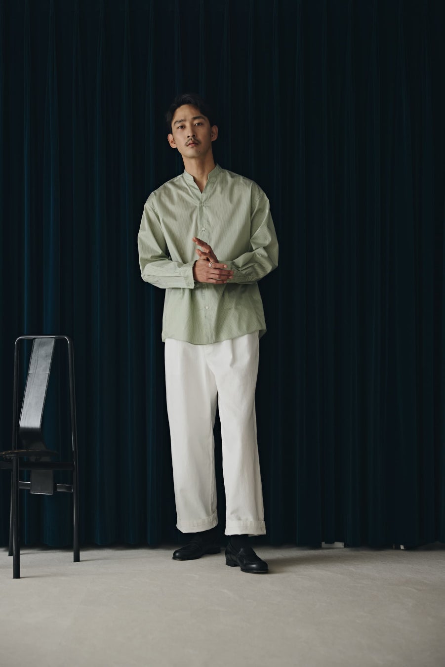 ・SHIRT:「OtoNANO」大人のワイドシャツバンドカラー ストライプ長袖 ¥9,900(税込)
