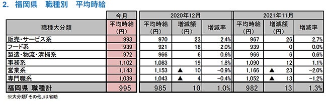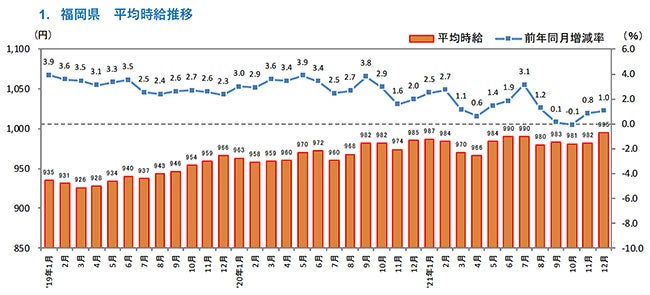 [福岡県版]2021年12月度 アルバイト・パート募集時平均時給調査 福岡県の12月度平均時給は前年同月より10円増加の995円