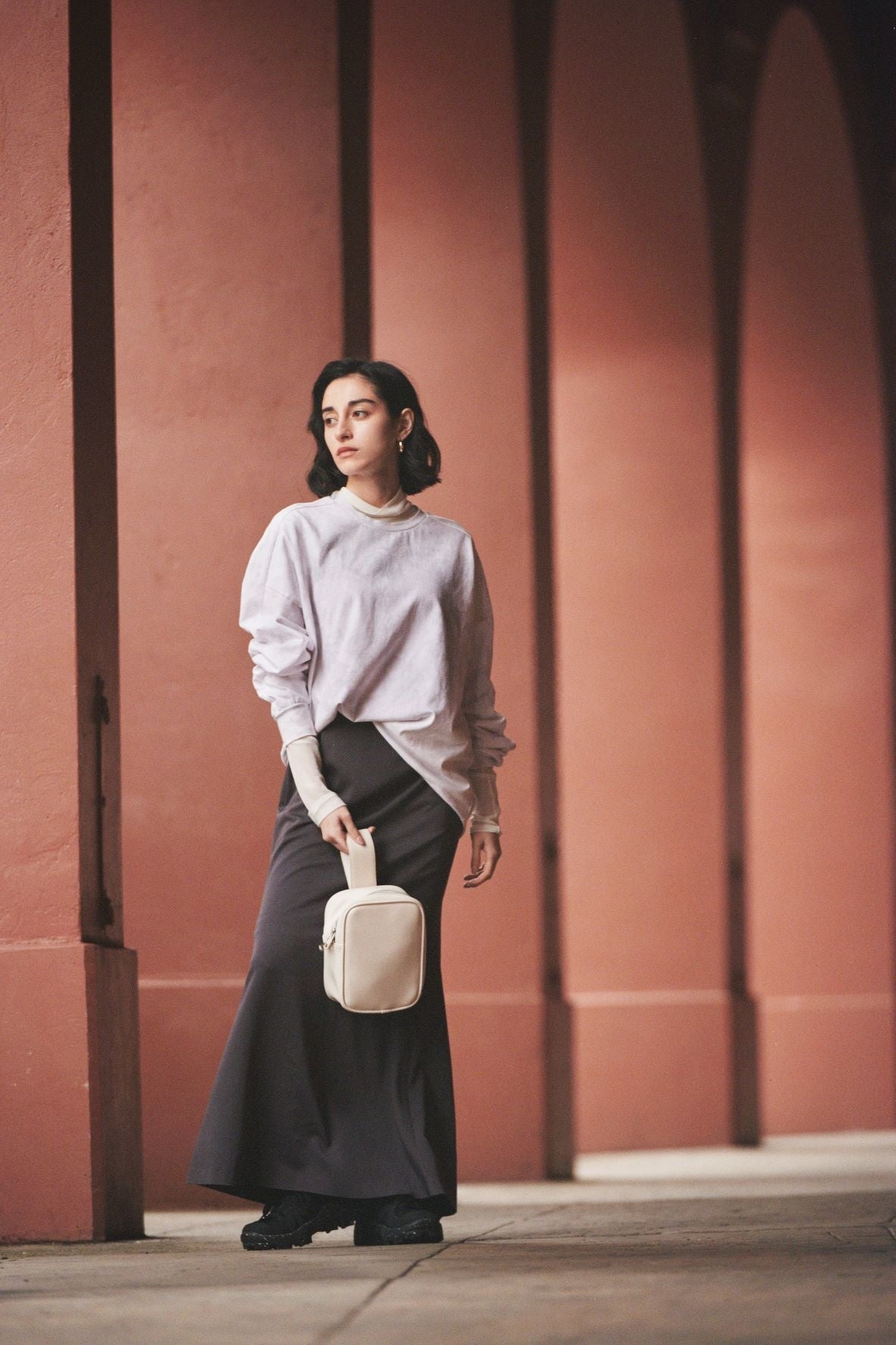 バックパックは、ミニマルなサイズ感と品のある光沢がきれいめなスタイルにもフィットします。