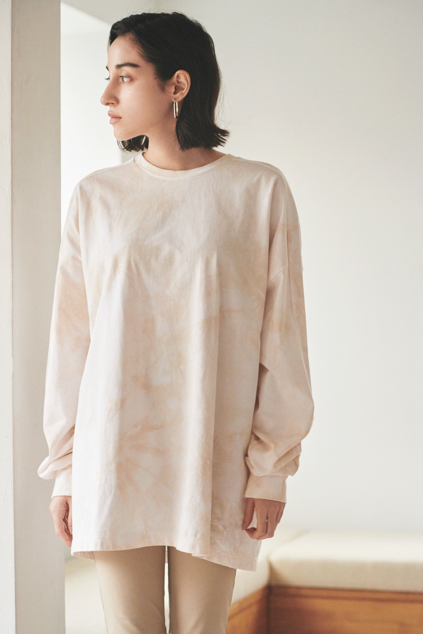 PUMAのアイコンであるテーパードをスリーブにあしらったオーバーサイズのロンTのボディーを使用し、東京のエコテックス®認証の染め工場で絞り染めを施した、サステナブルかつ、デザイン性のあるアイテム 。