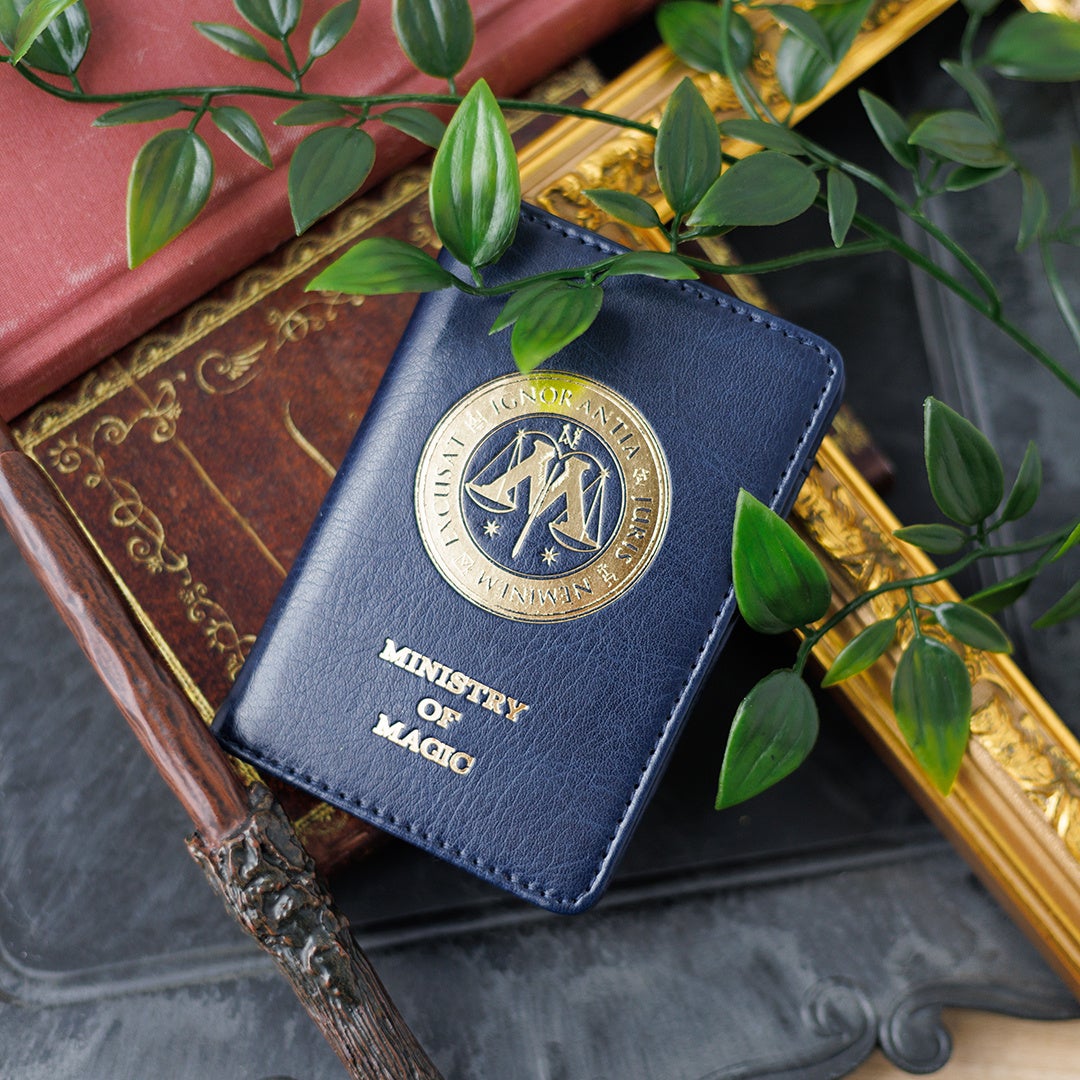 魔法省デザインのパスケースです。紺色がベースの重厚感あるデザインで、付属の紋章付きのカードには写真を付けることもできます。カードポケットが5つ付いており、別売りのネックストラップを付けることも可能です。