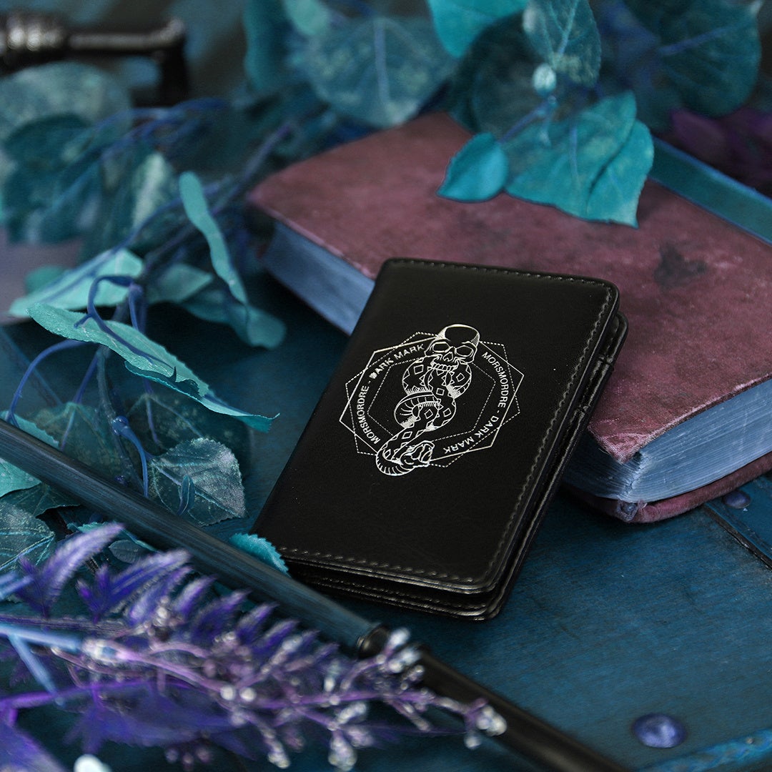 ヴォルデモートの信奉者、デス・イーターたちの左腕に刻まれた「闇の印」がデザインされた、ダークな雰囲気のパスケースです。カードポケットが5つ付いており、中面には闇の印を打ち上げる呪文「MORSEMORDRE」が刻まれています。