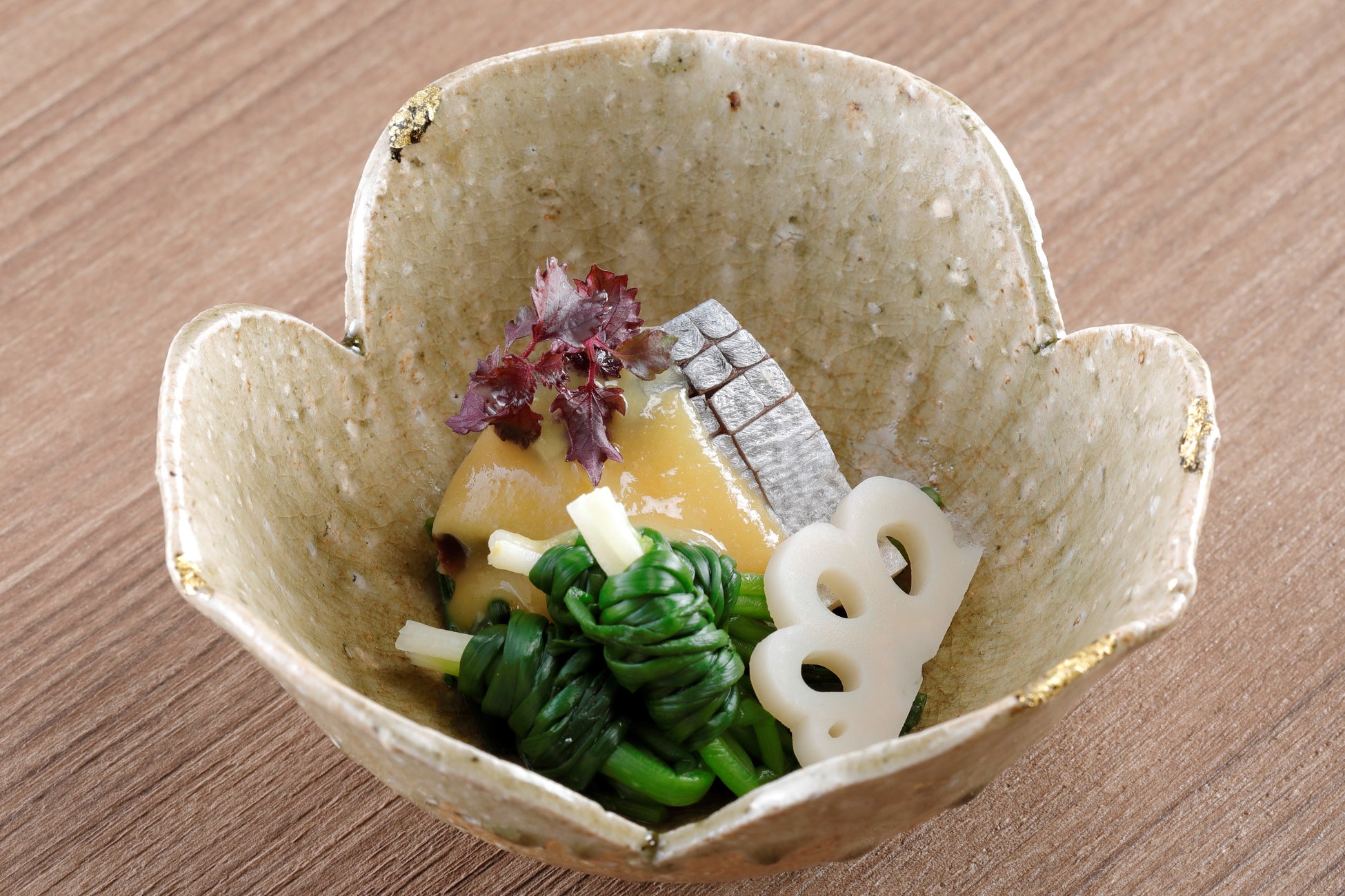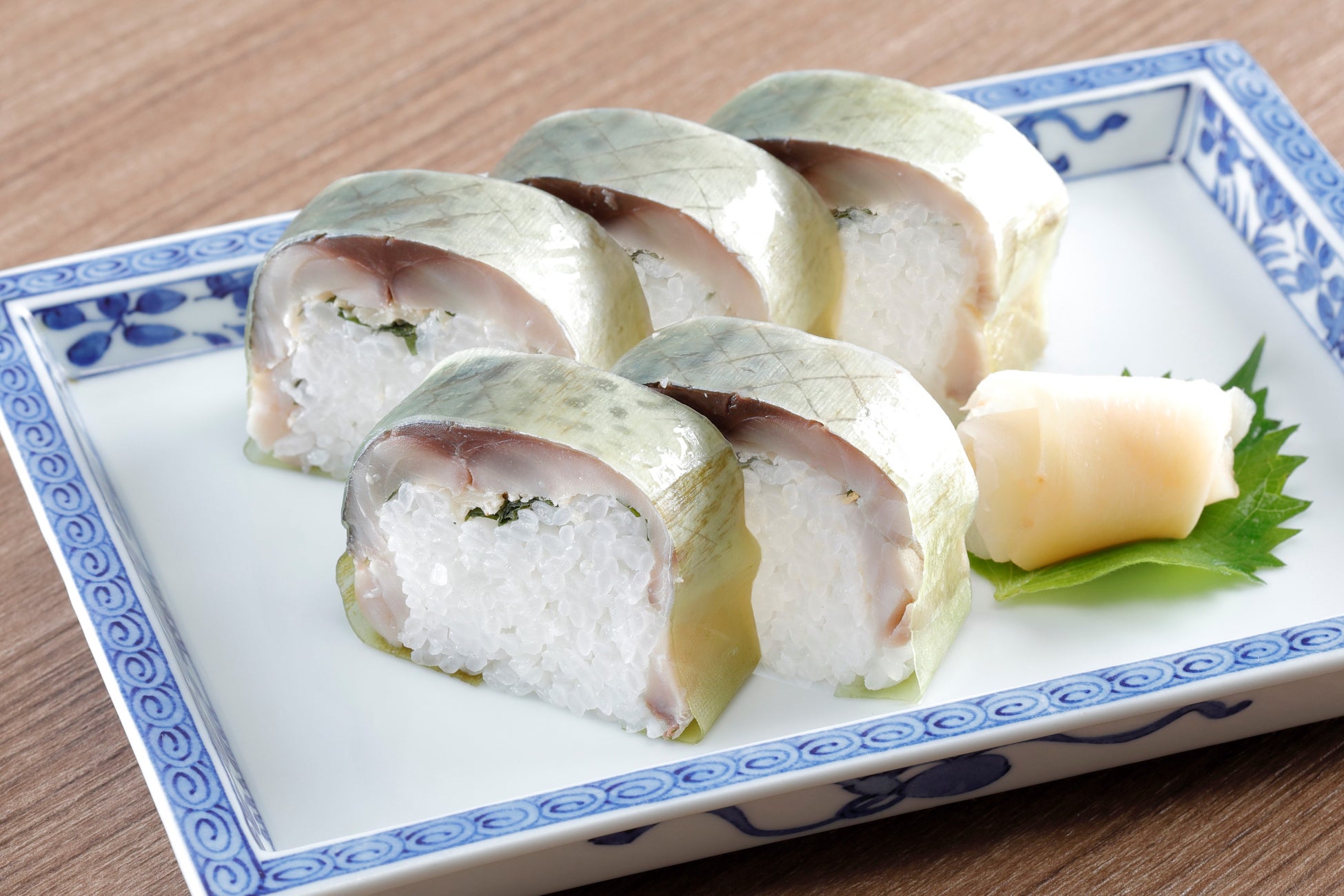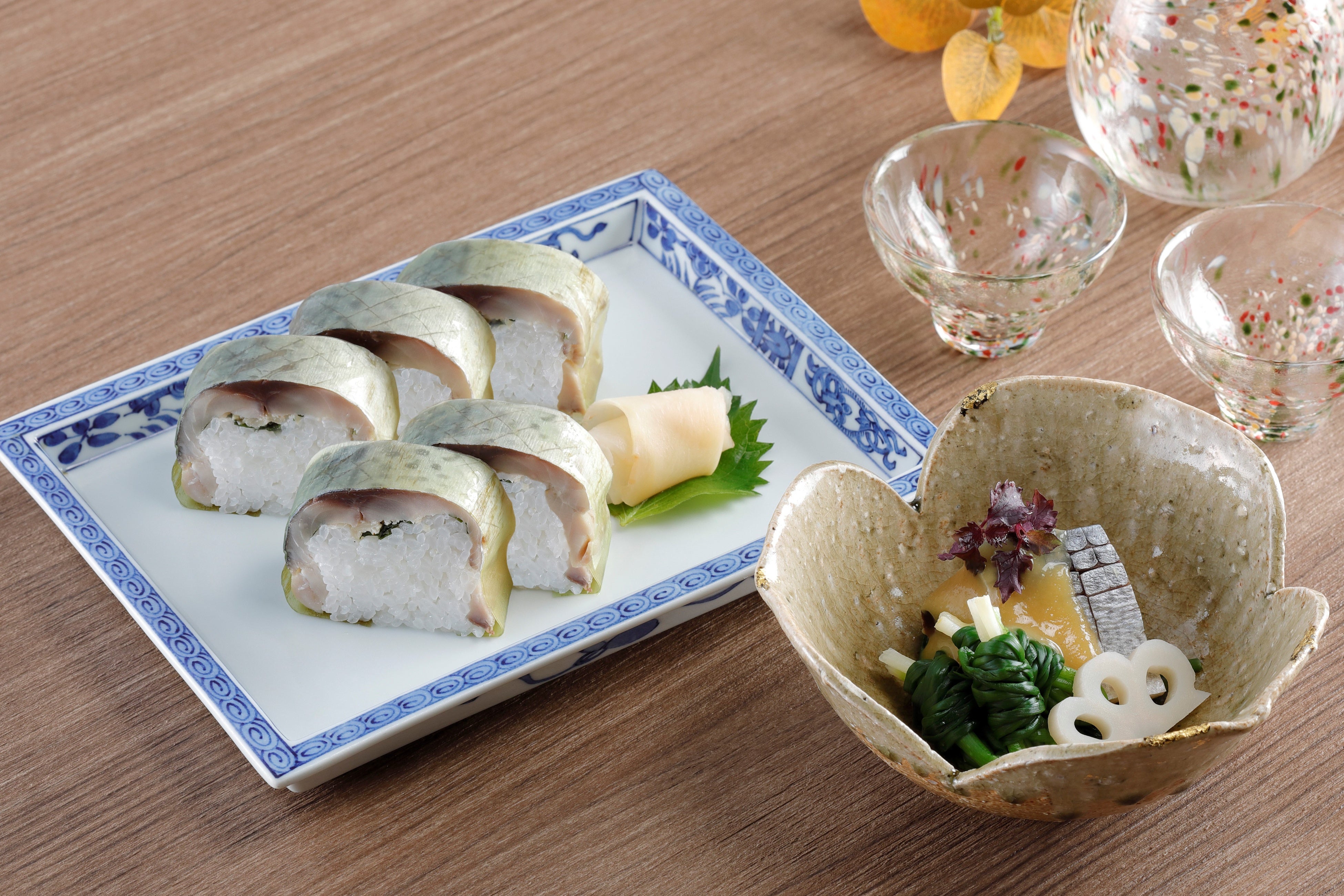 高知県のブランド「土佐の清水さば」の〆さばと富山県産「こしひかり」を使用した酢飯に、生姜と大葉をアクセントに加え、甘酢で炊いた昆布で巻き上げました。ホテル開業当時から受け継がれている寿司酢は昆布、胡麻、オレンジなどを漬け込み一ヶ月ほどねかせて仕上げています。