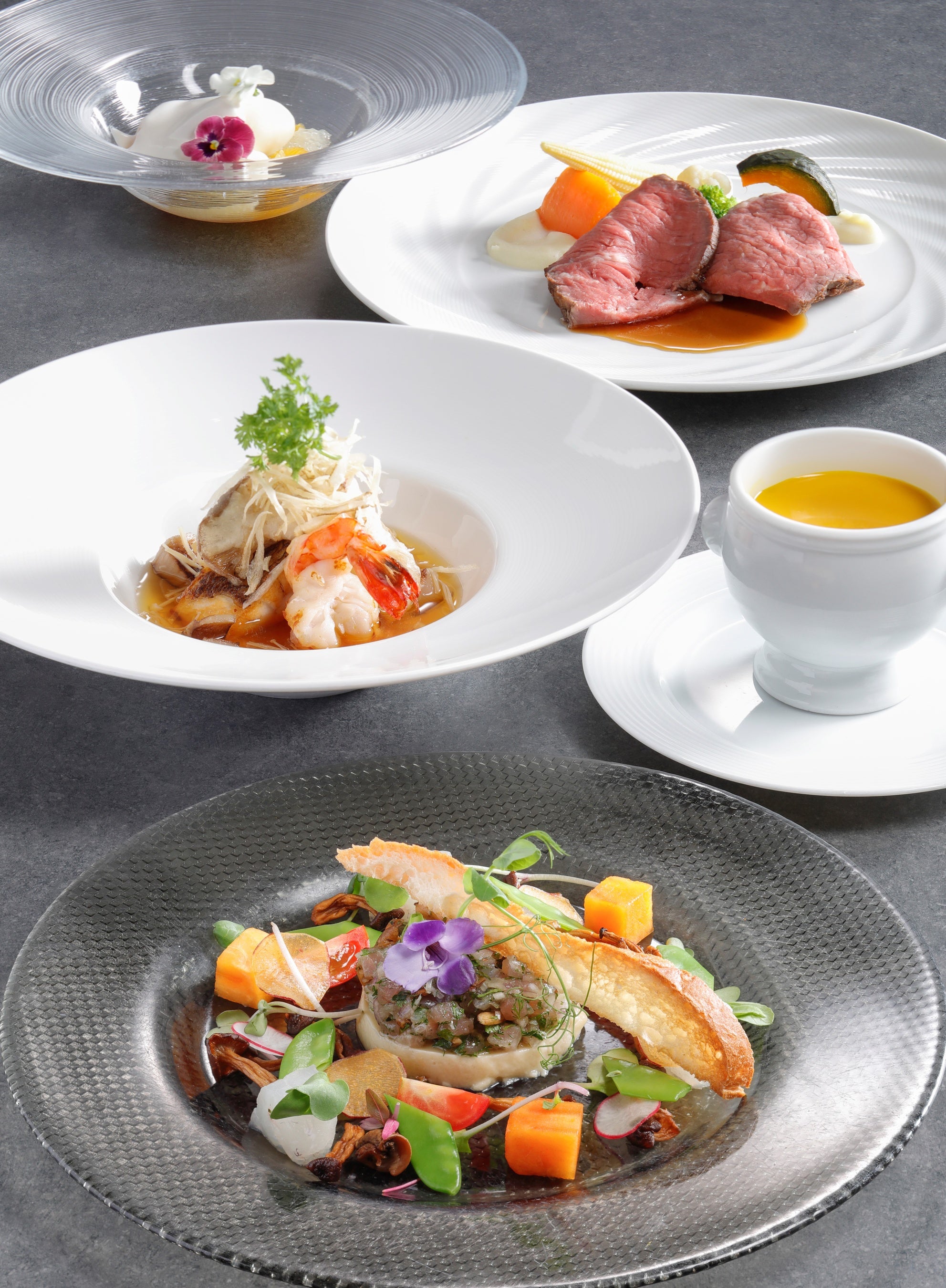 アミューズ / 高知県産 戻り鰹、リンゴ、茄子ムースのセルクル仕立て カンパチの香草マリネ、柿と共に / クリームスープ / 高知県産「海援鯛」と海老のポワレ 柚子風味のクリアなスープで ごぼうのフリットを添えて / 牛ロース肉の低温調理 温製野菜とレホール添え / フルーツのマチェドニア 柚子のエスプーマ / コーヒーまたは紅茶