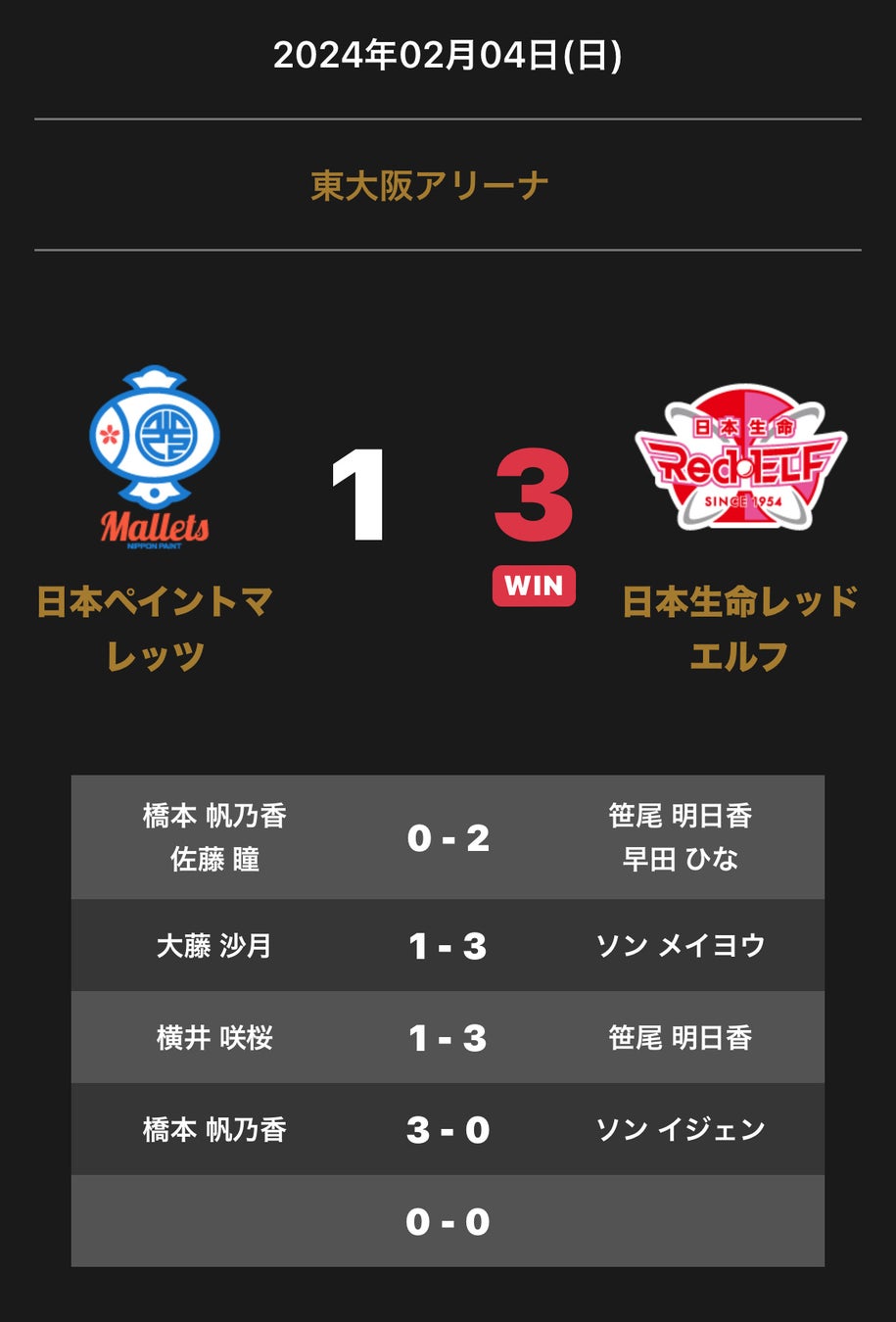 ノジマTリーグ 2023-2024シーズン 公式戦 2月4日開催 「日本ペイントマレッツ vs 日本生命レッドエルフ 」の試合は、3-1で日本生命レッドエルフが勝利しました。