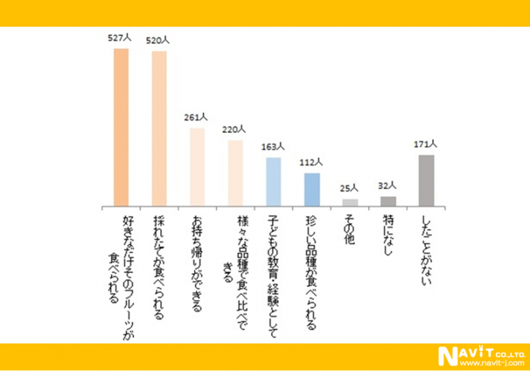 やはり服風回答可でフルーツ狩りの魅力についての問いには、「好きなだけそのフルーツが食べられる」527人と「採れたてが食べられる」520人がほぼ同数で並びました。