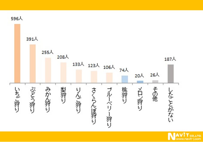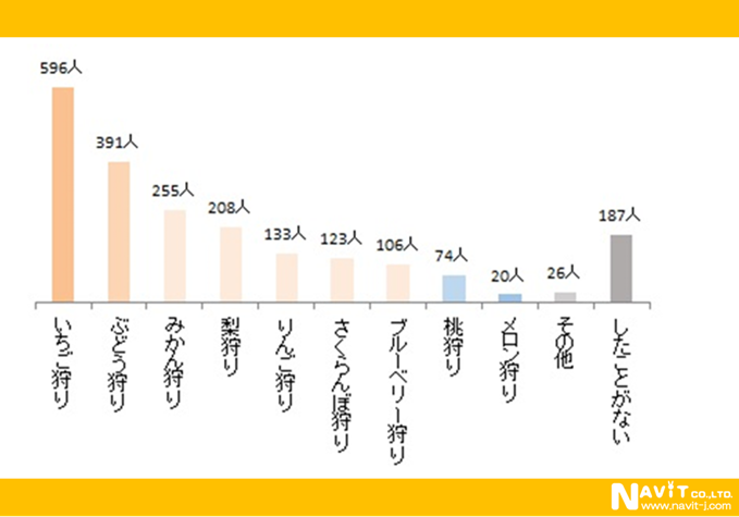 どんなフルーツ狩りに行ったのかとの問いには「いちご狩り」がトップで、596人でした。以下「ぶどう狩り」391人、「みかん狩り」255人、「梨狩り」208人と続きます。