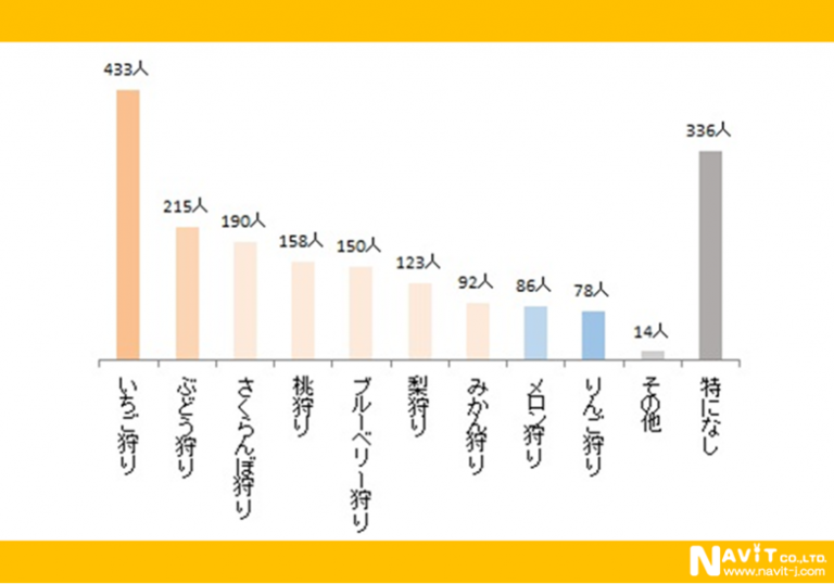 今年行ってみたいフルーツ狩りの問いには、「いちご狩り」433人と「ぶどう狩り」215人が、これまで行ったことのあるフルーツ狩りと同様に1,2位を占めました。