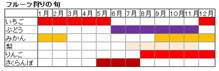 表はフルーツ狩りの場を提供する農園が発信する旬の情報を、ごく大ざっぱにまとめたものです。