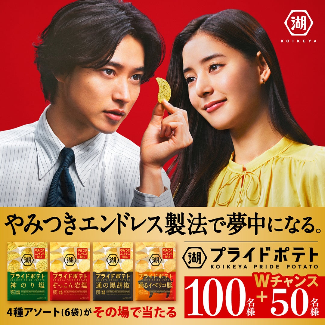 CMでは初共演となるおふたりの新CMとともに、“やみつきエンドレス製法”でさらに美味しく進化した「湖池屋プライドポテト」を多くのみなさまに知っていただき、お試しいただきたいとの思いから、「湖池屋プライドポテト」4品(計6袋)がその場で当たるキャンペーンを実施します。みなさまぜひご応募ください!