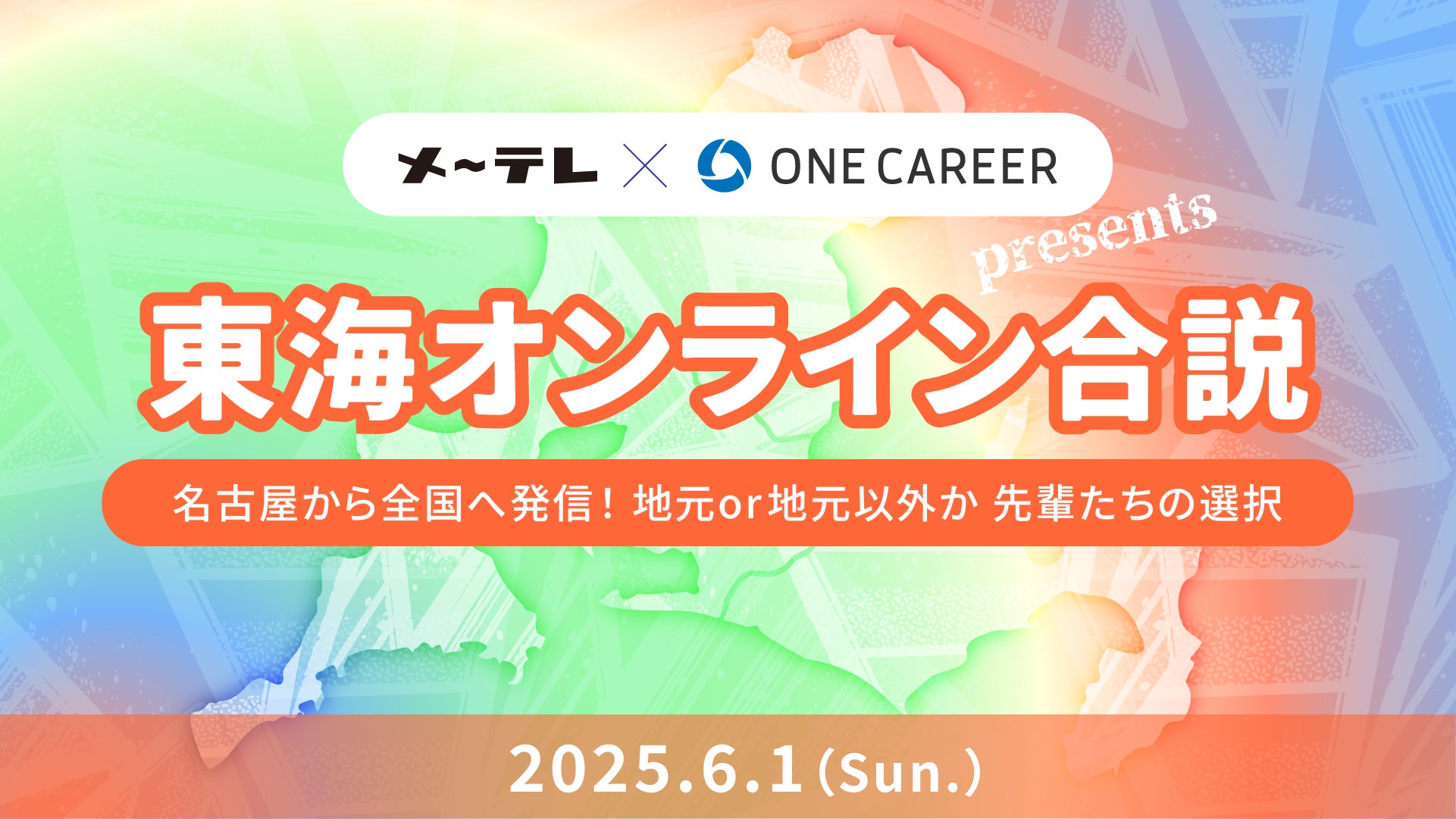 メ~テレ(名古屋テレビ放送)は、就活サイト「ONE CAREER」を運営する株式会社ワンキャリア(本社:東京都渋谷区、代表取締役社長 執行役員CEO:宮下 尚之、以下「ワンキャリア」)と共同で、東海エリアにゆかりのある学生を対象にしたオンラインイベント「東海オンライン合説」を、6月1日(日)にワンキャリアのYouTubeチャンネルで配信します。