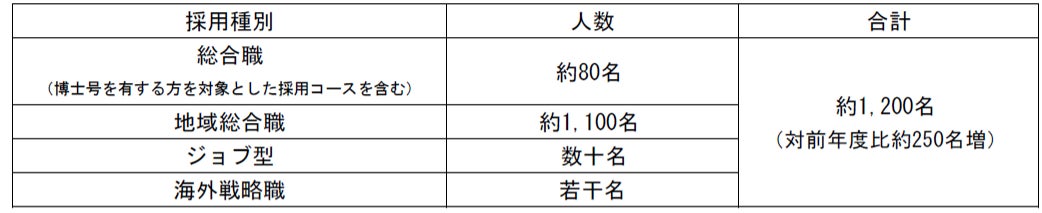 ・新卒採用(ジョブ型)及び経験者採用(総合職・ジョブ型)については、他の採用コース同様に、高等学校、短期大学・専門学校卒業も応募条件の対象に加え、より多様で優秀な方から応募いただけるようにしていきます。