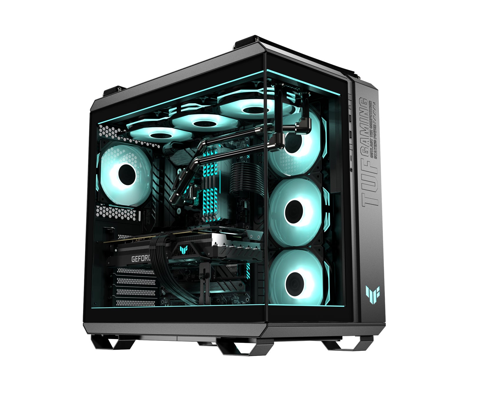 ASUSのゲーミングシリーズTUF GAMINGより、ピラーレスデザインのハンドル付PCケース「TUF Gaming GT502 Horizon」白黒2色および専用のライティングカスタムキットを発表