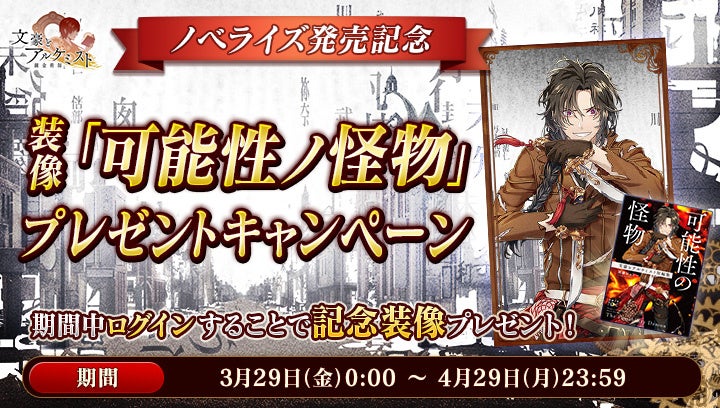 ゲーム内では3月29日(金)0:00 ~ 4月29日(月)23:59の期間中、「文豪とアルケミスト」へのログインで装像「可能性ノ怪物」を入手できるキャンペーンが行われる予定です。こちらもぜひチェックしてみてください。