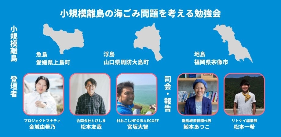 2022年11月25日(金)に開催されたオンラインイベントでは、離島経済新聞社代表・統括編集長の鯨本あつこが司会を務め、小規模離島地域101島のアンケート調査結果と10島での現地調査に携わったリトケイ編集部の松本一希が調査結果について報告。海洋ごみの課題を抱える小規模離島3地域(地島・人口約130人/魚島・人口約120人/浮島・人口約180人)より地域の実情について語っていただきました。また、海洋ごみ対策の先進事例として、離島地域の海洋ごみ問題に取り組む3名のゲストに日頃の活動を発表していただきました。