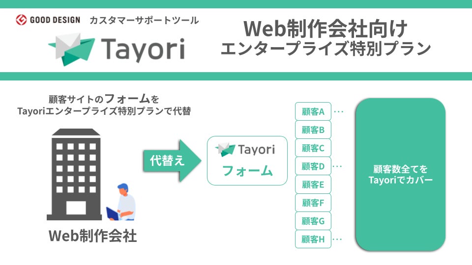 Web制作会社向けTayoriエンタープライズ特別プランを契約いただくことで、各顧客のTayoriの個別アカウントを発行することができ、顧客フォーム制作・保守運用を行っていただくことが可能です。