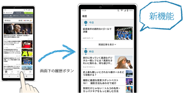 画面下の「履歴」ボタンから過去の閲覧記事を確認できるようになります。さらに、関連する記事も閲覧することができます。