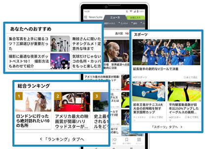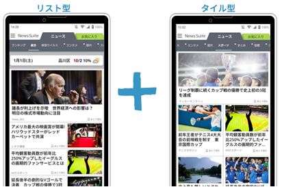 これまでの文字中心である「リスト型」見出しに加え、画像中心である「タイル型」見出しを追加します。総合、エンタメ、スポーツなどの各ニュースタブ(ジャンル、カテゴリー)に合わせたデザインレイアウトを採用しており、見出しから多くの情報を直感的に得ることができます。