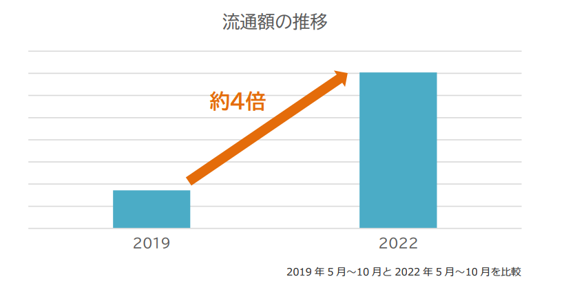 新型コロナウイルスの影響を受ける前の従来のエシカル商品の流通額と、現在のエシカル商品の流通額を比較すると、3年で約4倍に増加しています(2019年5月~10月と2022年5月~10月の比較)。サステナブルな社会に向けた動きが広がりをみせるなか、エシカル消費への注目度も上がってきていることがうかがえます。