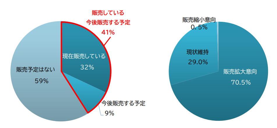 今年5月、中小メーカー勤務者を対象に「エシカル商品の製造・卸販売に関する実態調査*」を実施したところ、エシカル商品を販売している中小メーカーは全体の4割と半数に満たないものの、そのうち7割は販売拡大意向であることがわかりました。
