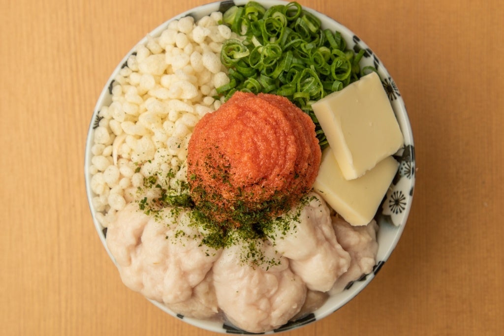 もつ鍋と並ぶ博多の名物鍋と言えば「水炊き」。もつとはまた違う、鶏出汁の滋味深い味わいが、もんじゃ焼きの生地の中に広がります。キャベツ、にんじん、しめじと、野菜&きのこもたっぷり入ったヘルシーな一品です。