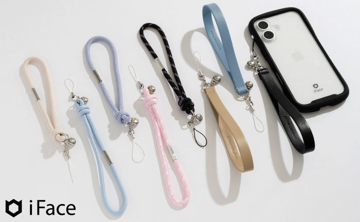 「iFace」のスマホケースにアクセサリー感覚で付け替えができる「iFace Phoneチャーム」から、シンプルなデザインでカスタムしやすい【PUレザー】と、すっきりとした結び目でカラバリが豊富な【丸紐】を使用した8種類の新デザインが登場します。