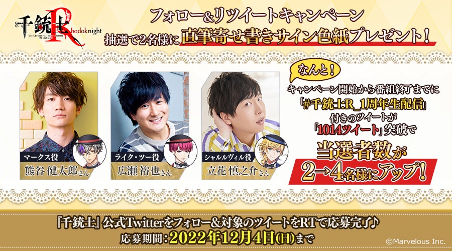 「千銃士」公式Twitterアカウントでは熊谷健太郎さん(マークス役)と広瀬裕也さん(ライク・ツー役)と立花慎之介さん(シャルルヴィル役)の直筆寄せ書きサイン色紙が抽選で4名様に当たるキャンペーンを開催中です。奮ってご応募くださいませ!