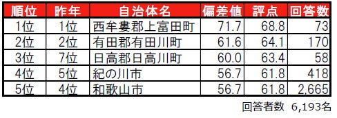 住みここち1位は4年連続で西牟婁郡上富田町。2位は2年連続で有田郡有田川町。3位日高郡日高川町。