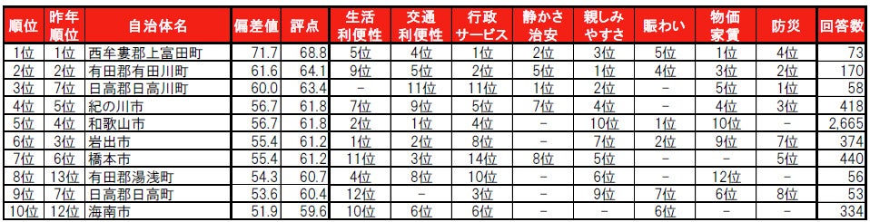日高郡日高川町が、昨年7位から順位を上げて今年は3位です。因子別では「静かさ治安」「防災」で1位の高い評価を得ています。トップ3は全て郡部に属する「町」という結果になっています。