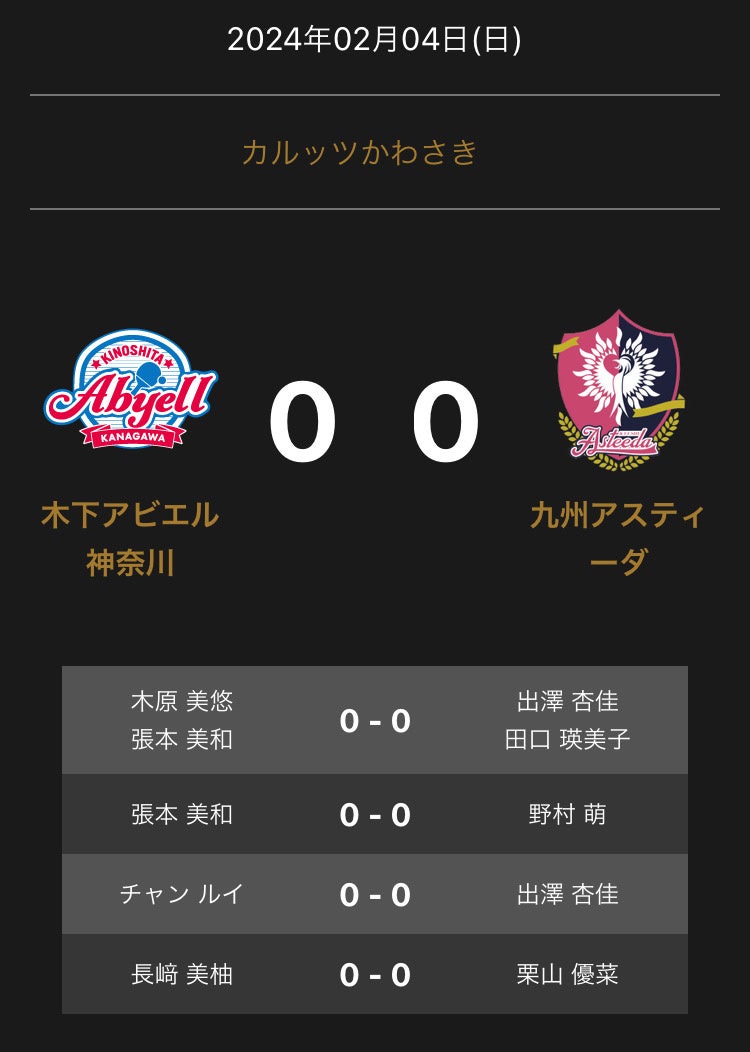 ノジマTリーグ 2023-2024シーズン 公式戦 2月4日開催 木下アビエル神奈川 vs 九州アスティーダ 対戦オーダー発表