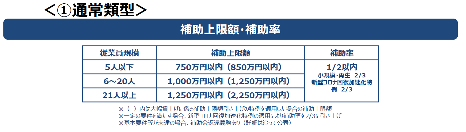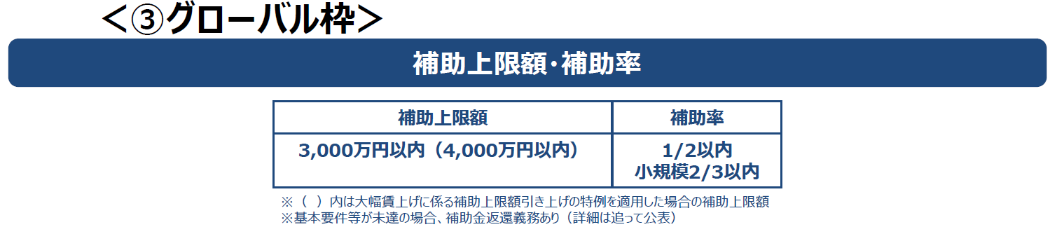 通常類型とグローバル枠があり、補助額上限・補助率は以下のようになっている。