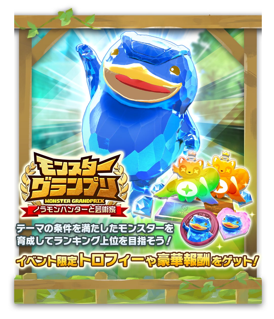 「モンスターグランプリ『ノラモンハンターと芸術家』」を開催します。前半、後半で3つずつ用意されたテーマに沿ってモンスターを育成完了し、「いいね(総合力を元にしたポイント)」でランキングを競います。月の前半、後半を合算した総合ランキングにより獲得できる専用トロフィーには総合ランキングの順位が保存され、いつでも確認することができます。イベントの詳細はゲーム内にてご確認ください。