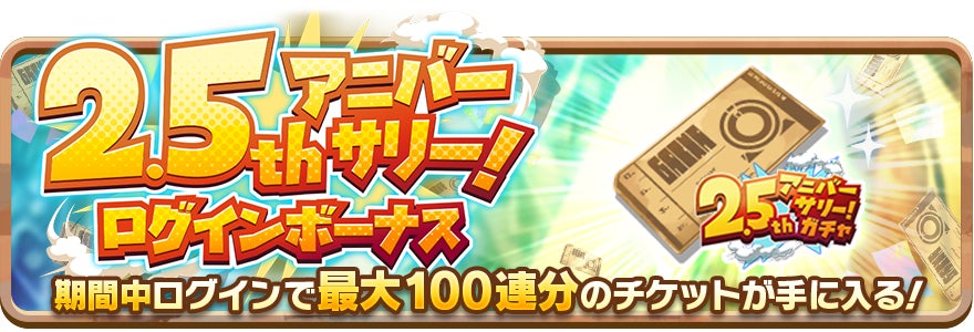 10日間ログインで最大200枚のアニバーサリーチケットを獲得できるログインボーナスを開催します。チケットは「2.5thアニバーサリーガチャ」で使うことができます。